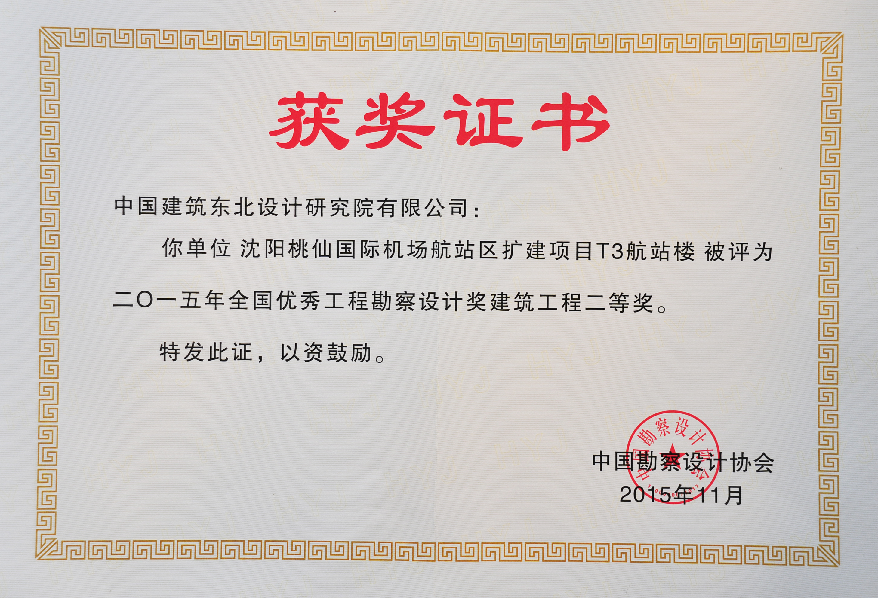 4 沈阳桃仙国际机场航站区扩建项目T3航站楼 建筑工程二等奖 沈阳桃仙机场是东北区域性枢纽机场和全国航空货运枢纽,作为机场航站区的主航站楼,T3航站楼位于进场路中轴线上,平面呈“U”形布置,建筑面积24.6万平方米,可供30架大型飞机(5E10D15C)同时停靠使用,设计年旅客吞吐量1750万人次,高峰小时旅客吞吐量6430人,是一座国内国际共用,流程极其复杂的大型交通建筑。